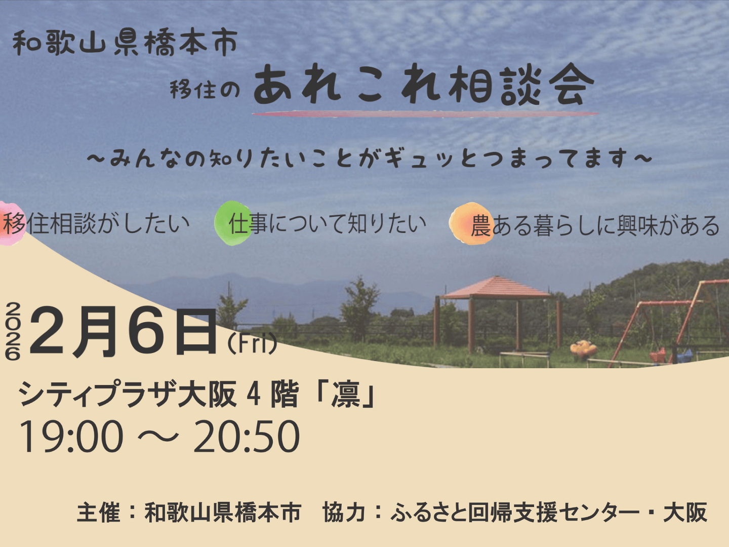 山・川・田んぼ・畑・果樹園が広がるのんびり田舎暮らしができる「大阪に一番近い田舎まち橋本市」。大阪中心部から電車で乗り換えなし40分の場所です。スーパーや病院、駅が市内に何ヶ所もあり、緑が広がる田舎だけれど便利なまち。妊娠から子育てをするすべての方が相談できる子育て世代包括支援センターや中学卒業まで医療費無料など安心して子育てができるのも自慢。都会にお住まいで、日常生活に困らない自然豊かな田舎で暮らしてみたい!子育てをしたい!といった方にとっておきの「はしっこ暮らし」が和歌山県の北東部のはしっこにあります。そんな暮らしの話を一度、聞いてみてください!