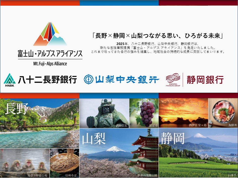 富士山・アルプス アライアンスは、静岡銀行・山梨中央銀行・八十二長野銀行の3行によるアライアンスです。静岡県・山梨県・長野県を中心に地域経済を支える3行が、移住される皆さまの新生活をサポートします!