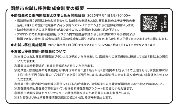 9月より募集開始いたしました「函館市お試し移住」。 10月16日現在で多くのお問い合わせをいただいております。 家族世帯・単身世帯ともに予定人数に達したため受付を停止しております。 随時、情報更新してまいります。 体験期間は2026年3月31日(月)チェックアウトまで。