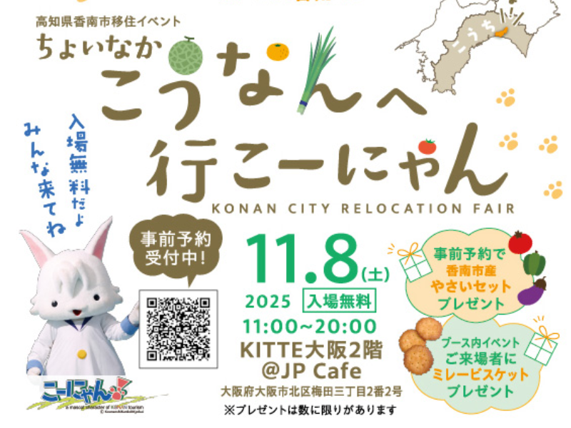 高知県のほぼ中央に位置する香南市(こうなんし)は、「ものすごーく田舎」というわけではない、「ちょっと田舎(ちょいなか)」なまちです。 何かと便利で動きやすいけど、海や山がすぐ近くで楽しい観光地もある、いいとこどりのコンパクトさが自慢です。 「移住」するのにちょうどいい 香南市が大阪で単独移住イベントを開催します! 【イベント概要】 ■イベント名 高知県香南市移住イベント ちょいなかこうなんへ行こーにゃん ■日程 令和7年11月8日(土) 11:00~20:00 ■場所 KITTE大阪2階 @JP Cafe(大阪府大阪市北区梅田三丁目2番2号) ■料金 入場無料 ■ワークショップ(事前申込制:参加無料) ★ファミリー向け:ミニ・シーキャンドルづくり 開催時間 1回目/13:00~ 2回目/15:00~ ■これなーに?香南市クイズ 随時開催 ■トークショー/移住者2人の高知の暮らし方を約30分間話していただきます。 ★ファミリー向けトークショー:子育て、子どもの遊ぶ場所、保育園・学校事情等 開催時間 1回目/13:30~ 2回目/15:30~ ★単身者向けトークショー:働き方、遊ぶ場所、生活について等 開催時間 1回目/14:30~ 2回目/16:30~ ■相談ブース/移住に向けて不安なことなど困りごとを相談できます。 ■出張販売コーナー/道の駅やす農産物直販所やすらぎ市より新鮮な野菜などが届きます。 ■資料コーナー/移住・観光・就職などの資料を自由にお持ち帰りください。 ※イベント内容は変更になる場合があります。