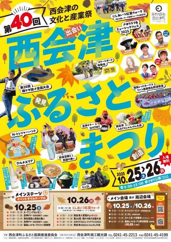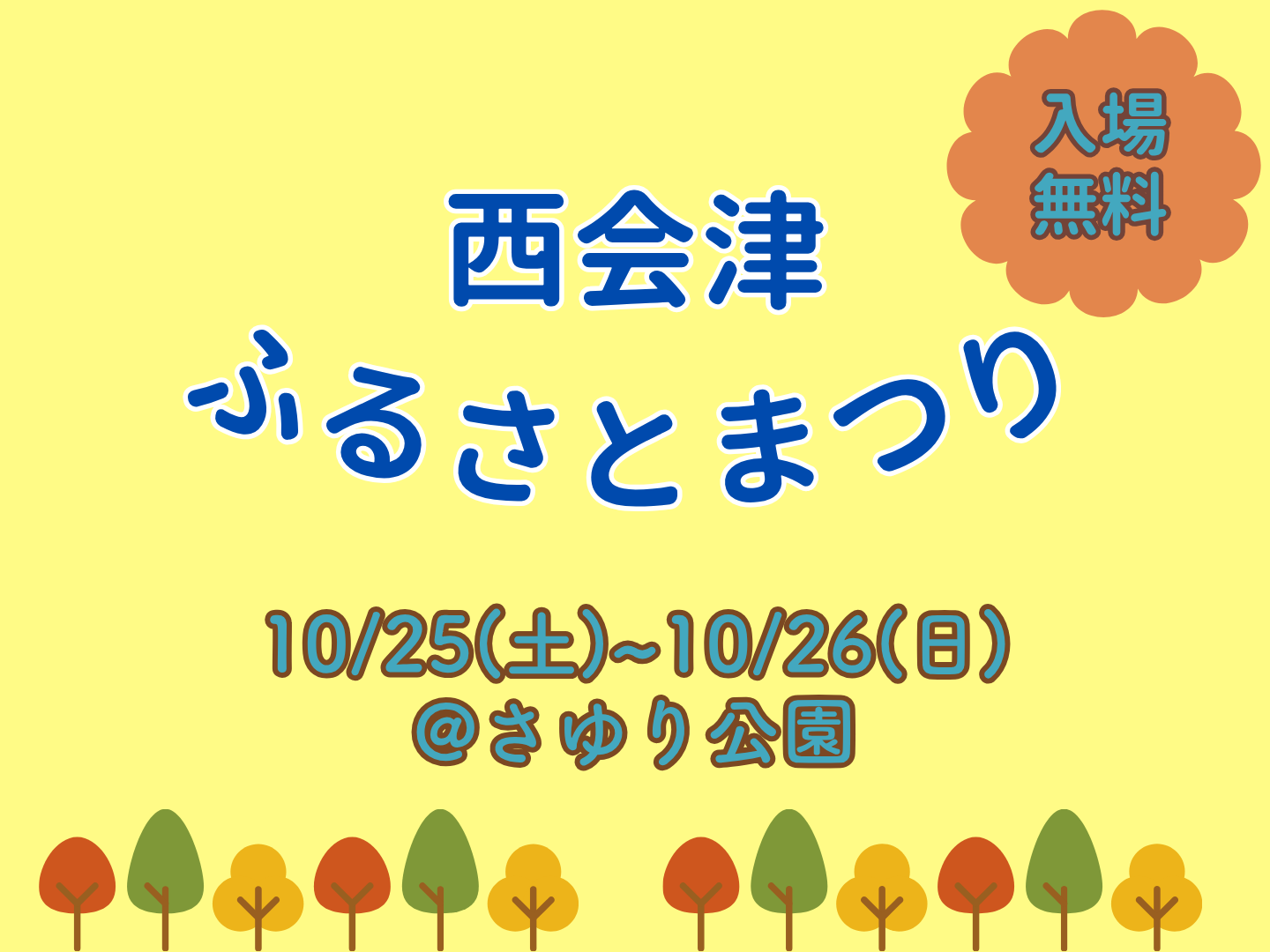 西会津秋の恒例イベント「西会津ふるさとまつり」を開催します! ステージイベントでは、お笑い芸人やアーティストによるライブステージ「さゆりラフ&ミュージックフェス」を今年も開催します。 特大桐ゲタを投げて飛距離を競う名物競技「桐ゲタ投げ全国大会」やご当地ヒーロー「丞神デナーショー」、イベントの最後には、 誰でも参加可能で西会津町の特産品が当たる「ふるさとじゃんけん大会」も開催します! また、毎年好評の紅葉ウォークや、西会津初開催となるムラサキスポーツプレゼンツ「スケートボード体験会」など、 魅力的な体験イベントも盛りだくさんとなっております。 西会津の誇る味噌ラーメン・新そば・日本酒・スイーツなど、おいしいグルメも盛りだくさん! ぜひ、西会津ふるさとまつりへおいでください! ↓詳細情報はコチラからご確認ください https://www.town.nishiaizu.fukushima.jp/soshiki/6/6112.html