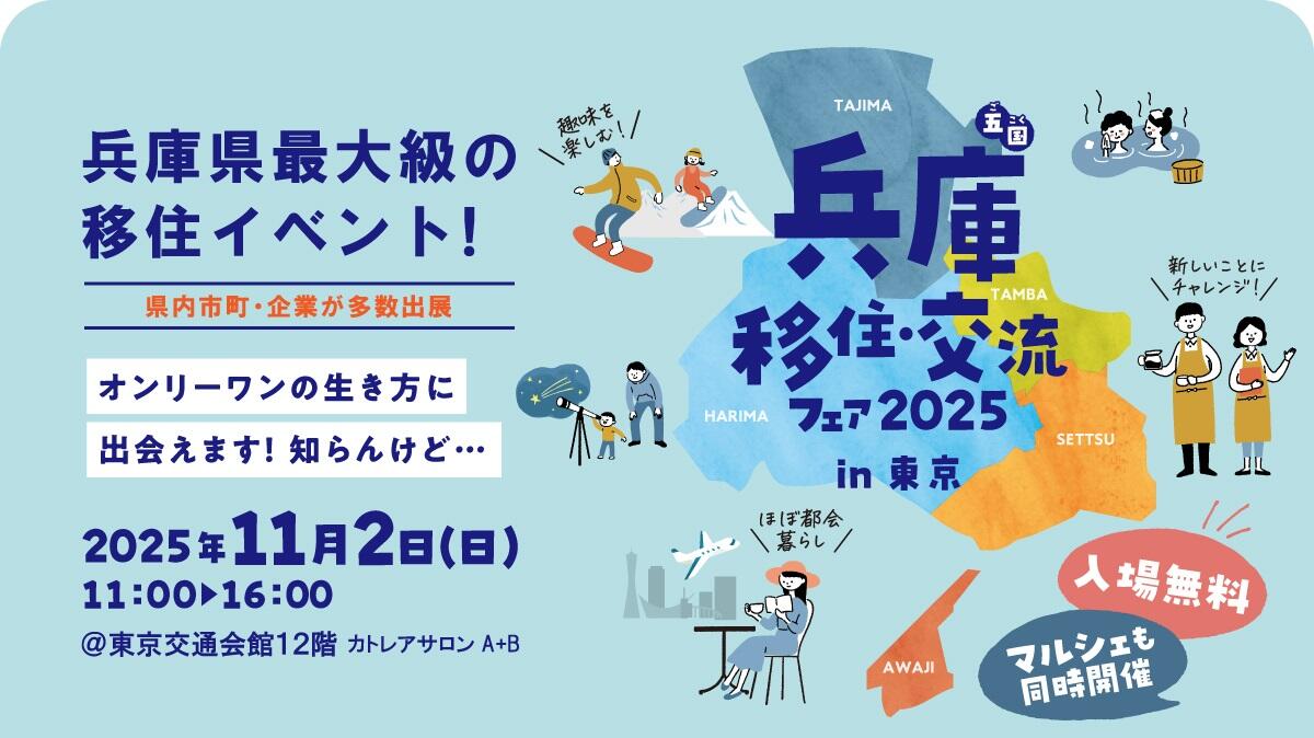 兵庫県内の市町や企業等が多数出展する「兵庫移住・交流フェア2025 in 東京」 移住相談ブースやテーマ別のトークショーが開催されるステージイベント、折り紙を使ったワークショップや兵庫県の豊かな食や文化を直接買うことができるマルシェまで、盛りだくさんのイベントです。 ーーーーー 「兵庫移住・交流フェア2025 in 東京」 ーーーーー ●開催日: 2025年11月2日(日) 11:00~16:00 ※途中入退場可 ●会場: 東京交通会館12階 カトレアサロンA+B (東京都千代田区有楽町2丁目10-1) ●参加費:無料! 事前の来場申込をいただくと、当日の入場がスムーズです。 申込フォームから来場申込の上当日来場いただいた方先着200名様には「はばタンクリアファイル」をプレゼント! ▶お申込み https://e-ve.event-form.jp/event/110652/hyogo-gokoku_iju_tokyo