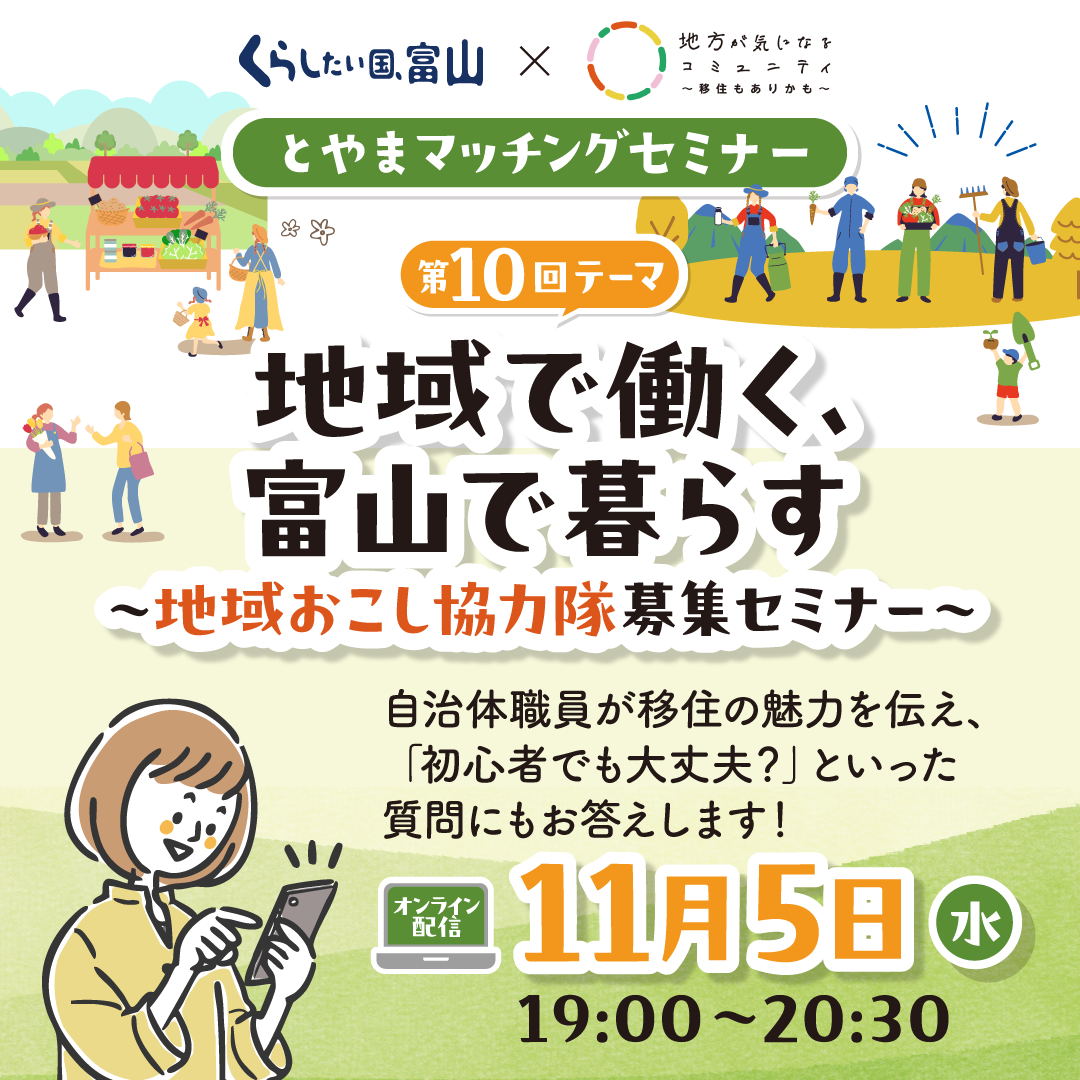 ・・・・・・・・・・・・・・・・・・・・・・・・・・・・・・・・・・・・・・ みなさん、こんにちは!産経新聞社の「地方が気になるコミュニティ」です。 「地方が気になるコミュニティ」では、地方の魅力や、地方暮らし、移住について、みなさんの想いを自由に話していただく場で、地方創生や移住にまつわるさまざまなイベント情報もお届けしています! ・・・・・・・・・・・・・・・・・・・・・・・・・・・・・・・・・・・・・・ 「地方が気になるコミュニティ」は、今年度、富山県とコラボ! 移住に興味がある方や、地方での新しい暮らしやキャリア、ライフスタイルを模索している方に向けて、オンライン移住セミナーを全15回にわたって開催しています。 第10回のテーマは、「地域で働く、富山で暮らす 〜地域おこし協力隊募集セミナー〜」。 近年、地域の課題解決や魅力発信の担い手として「地域おこし協力隊」が注目されています。今回は、現在隊員を募集している、または近々募集予定の、富山県内4市町(朝日町・黒部市・高岡市・氷見市)の職員が登壇! それぞれのまちの特徴や、地域おこし協力隊の活動フィールドをご紹介するとともに、移住についてや、隊員としての働き方のリアルにも迫ります!