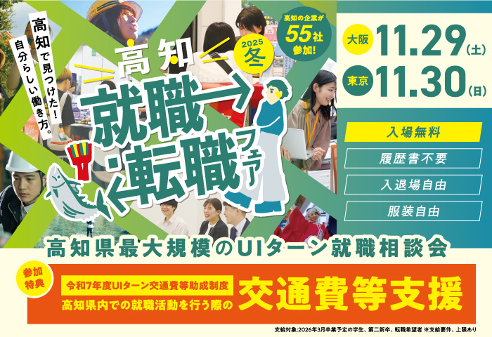 2025年11月29日(土)、30日(日)大阪・東京会場にて、【高知就職・転職フェア2025 冬】を開催いたします。