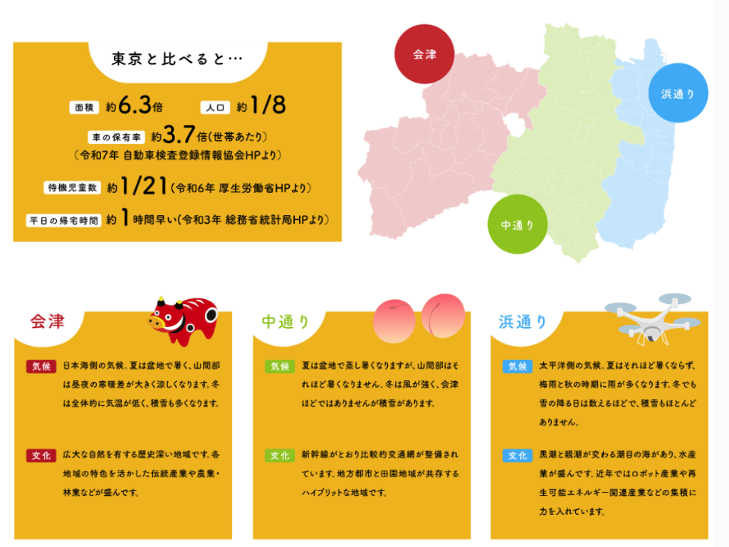 東北地方の一番南、北海道、岩手県に次いで全国で3番目の広さを持つ県です。 南北に連なる阿武隈高地と奥羽山脈を境に 西から「会津」、「中通り」、「浜通り」に 分けられる福島県は、異なる気候風土のもと、 3つの地域がそれぞれ魅力的な発展をしてきました。 ーー【アクセス】 福島県は東北地方の南の玄関口。 東北新幹線に乗れば、首都圏・福島県間はわずか90分程度! 東北自動車道、磐越自動車道、常磐自動車道と高速自動車道路網の整備も進んでおり、首都圏から車では約3時間でのアクセスが可能です!