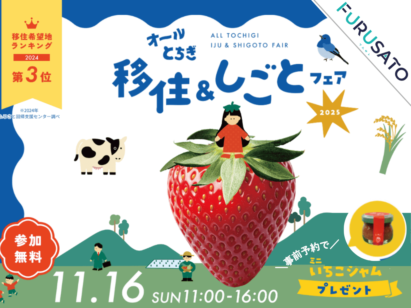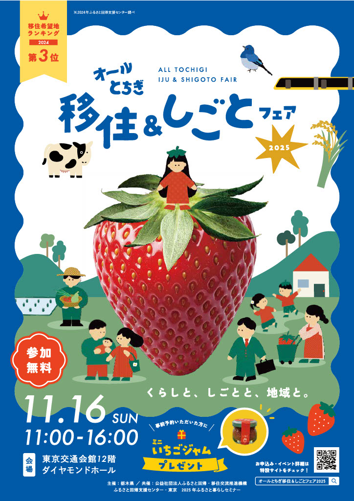 栃木県内の全25市町と県関係団体+企業・団体が大集結! ゲストによるトークイベントや市町・企業ブースで情報を収集しながら 県や市町の移住担当者と直接つながることのできるフェアです。 ーーーーー🍓🍓🍓 オールとちぎ移住&しごとフェア ーーーーー ■開催日: 2025年11月16日(日) 11:00-16:00 ■会場: 東京交通会館12階ダイヤモンドホール (東京都千代田区有楽町2-10-1) ■参加方法: ご予約なしでもご来場いただけます。 11/14(金)23:59までに事前予約いただいた方には「ミニいちごジャム」をプレゼント! ※当日お渡しできる数に限りがございます。なくなり次第終了となりますのでご了承ください。 ▶詳細はこちら https://www.tochigi-iju.jp/alltochigi2025/