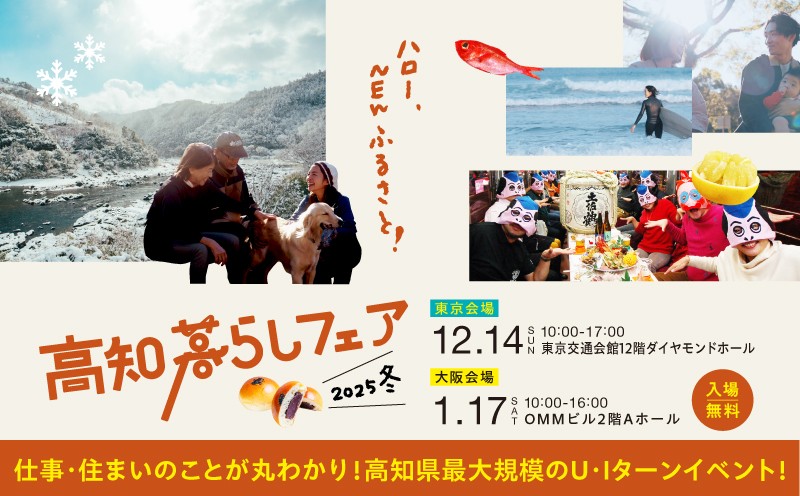 高知県最大のU・Iターンイベント、「高知暮らしフェア」! 高知県内全34市町村・お仕事・暮らし・教育など、移住に関する情報が一堂に集まります。 会場では、移住経験者によるリアルなトークセミナーや、子どもと一緒に楽しめるワークショップも。 さらに、来場登録特典として“高知県民のソウルドリンク・リープル”をプレゼント! アンケート回答でもらえる“芋けんぴ”など、うれしいお土産も満載。 高知での新しい暮らしを考え始めたばかりの方も、具体的に動きたい方も、 「まずは話を聞いてみたい!」という気持ちだけで大歓迎です。 この冬は、あなたの“高知暮らしの第一歩”を踏み出しませんか? \イベント詳細/ 【イベント名】どっちの県も素敵でSHOW! 【日時】2025年12月14日(日) 11:30~12:00 【場所】東京交通会館12階 ダイヤモンドホール(高知暮らしフェア内) 【参加費】無料 【特典】両県の会場へ入場された方、先着100名様(各会場)にご当地菓子をプレゼント! ※事前のお申込みは不要ですが事前登録しておくと入場がスムーズになります。 ご来場、お待ちしております!