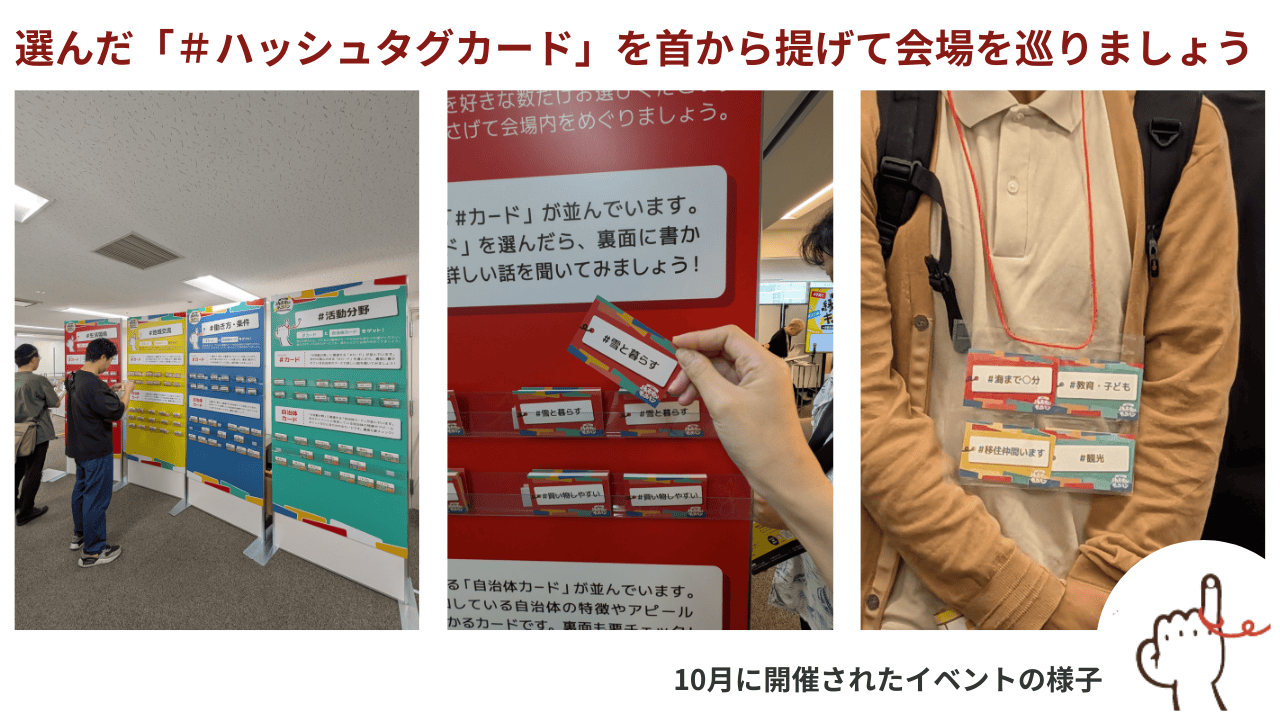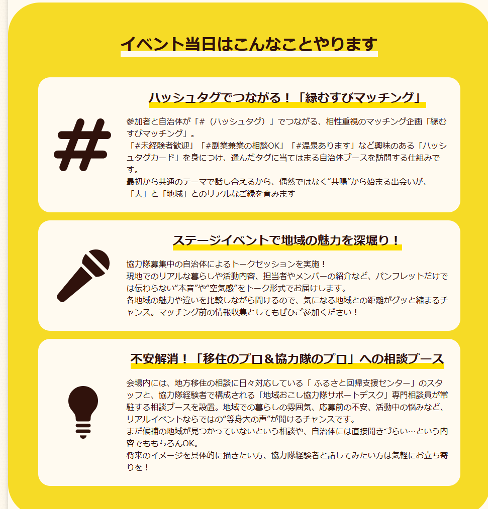 「地域おこし縁むすびキャラバン」は、地域おこし協力隊に関心のある方と、協力隊募集中の自治体がリアルで出会えるマッチングイベントです。 自分自身や地域の特徴を示す「#(ハッシュタグ)カード」を通じて、お互いに共鳴できる相手と出会う、「人」と「地域」のリアルな縁むすびを後押しします。 ーーー 「地域おこし縁むすびキャラバン」 ーーー ■開催日: 2025年11月29日(土) 13:00~16:30 ■会場: 東京交通会館12FカトレアサロンA 東京都千代田区有楽町2-10-1 ■参加費:無料! ■ご来場登録(必須) オンラインでの事前来場登録をお願いしています。 当日は受付で、スマホのQRコードをかざすだけのスマート受付です。 ▶お申込みはこちらから https://chiikiokoshi-enmusubi1129.peatix.com/ ーーーーー