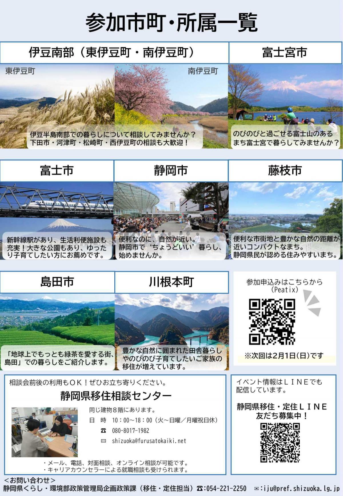 日時:2025年12月14日(日曜日)11時~14時30分 場所:東京交通会館8階ふるさと回帰支援センターセミナールームB (東京都千代田区有楽町2丁目10-1) 参加市町:東伊豆町、南伊豆町、富士宮市、富士市、静岡市、藤枝市、島田市、川根本町 注意事項:11時~12時は混雑するため、お待ちいただく場合があります。 https://iju.pref.shizuoka.jp/event/goudou12.htmlからお申込みください。
