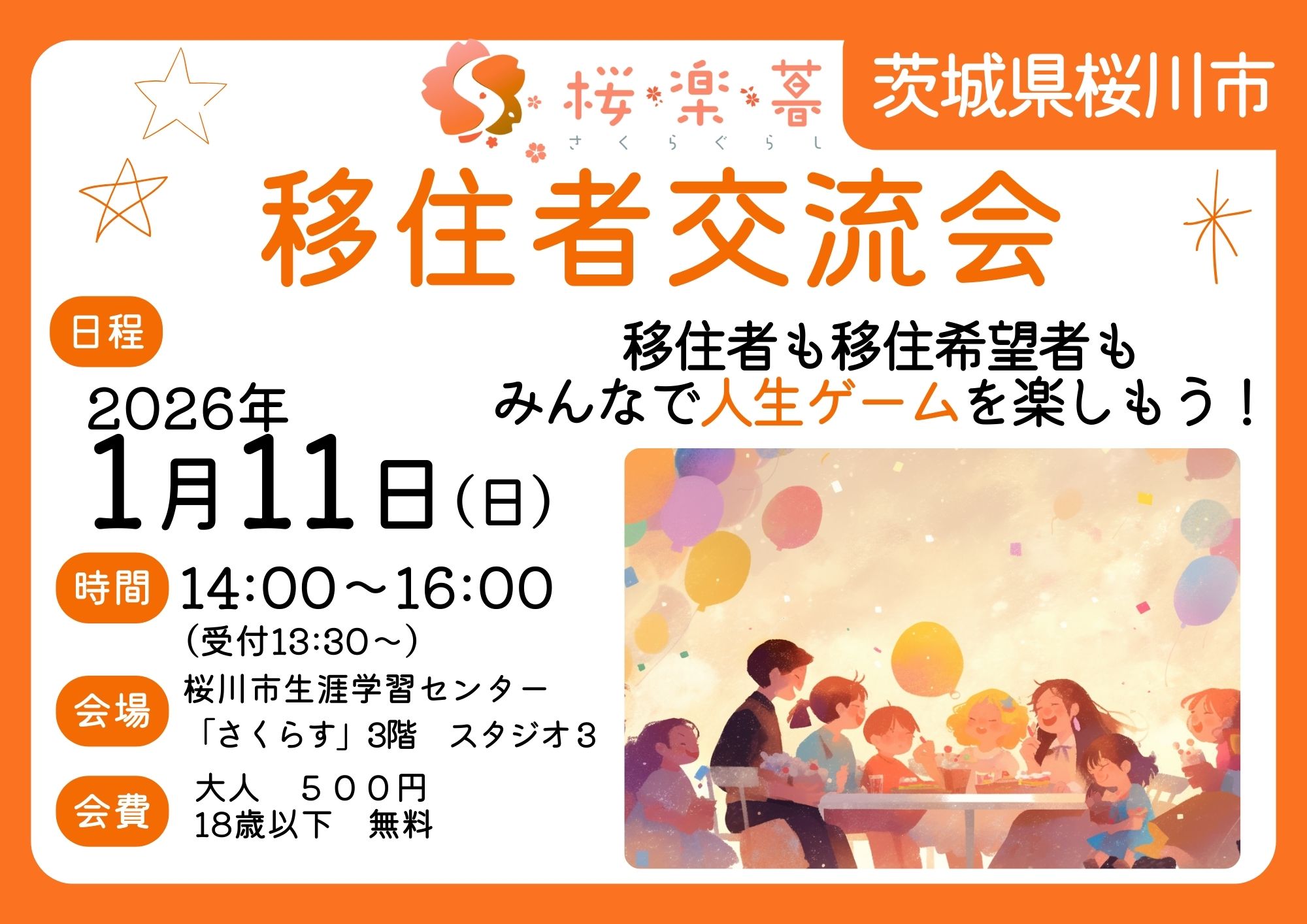 東京から約70㎞圏内、茨城県の中西部に位置し、南には「筑波山」がそびえ、市の中央部を南北に市名の由来にもなった「桜川」が流れるなど、自然環境に恵まれています。 市を囲む山々には数多くのヤマザクラが自生し、開花時期にはピンクの桜花と赤芽が木々の芽吹きと重なり、パッチワークのような眺望を楽しめます。初夏はアジサイ、秋には紅葉と、季節ごとに異なる表情が見られるのも魅力。山々や湖を眺めながらの爽快サイクリングやハイキング、キャンプなどのアウトドアも満喫できます。 石材業や平野部の肥沃な土地を利用した農業など、地域資源を活用した地場産業が息づいています。豊かな歴史に彩られた町としても知られ、真壁の町並みをはじめ、安産子育ての霊場として知られる「雨引山楽法寺」など、数々の歴史的遺産や名所旧跡が現存しています。 【イベント詳細情報】 日程: 2026年1月11日(日) 時間: 14:00~16:00 (受付 13:30~) 会場: 桜川市生涯学習センター「さくらす」 3階 スタジオ3 住所: 茨城県桜川市東桜川1-21-1 会費: 大人 500円 / 18歳以下 無料 定員: 約20名(先着順) 申込締切: 2026年1月9日(金)まで 申込方法:専用申込みフォームまたはお電話でお申し込みください お電話:0296-58-5111 (桜川市役所 ヤマザクラ課 担当:尾﨑) ※受付時間:平日 9:00~17:00 主催: 桜川市役所 ヤマザクラ課 / 地域おこし協力隊 尾﨑亜美 お問い合わせ: sakuragurashi@gmail.com 当日スケジュール 13:30~受付開始 14:00~14:10 開会・主催者挨拶・オリエンテーション 14:10~14:35 フリー交流タイム(おやつ&飲み物) 14:35~15:45 メインイベント:移住者版人生ゲーム 15:45~15:55 感想共有・地域情報紹介 15:55~16:00 アンケート記入・閉会 交流会の後、個別で移住相談の対応を致します。 お気軽にお声かけください。