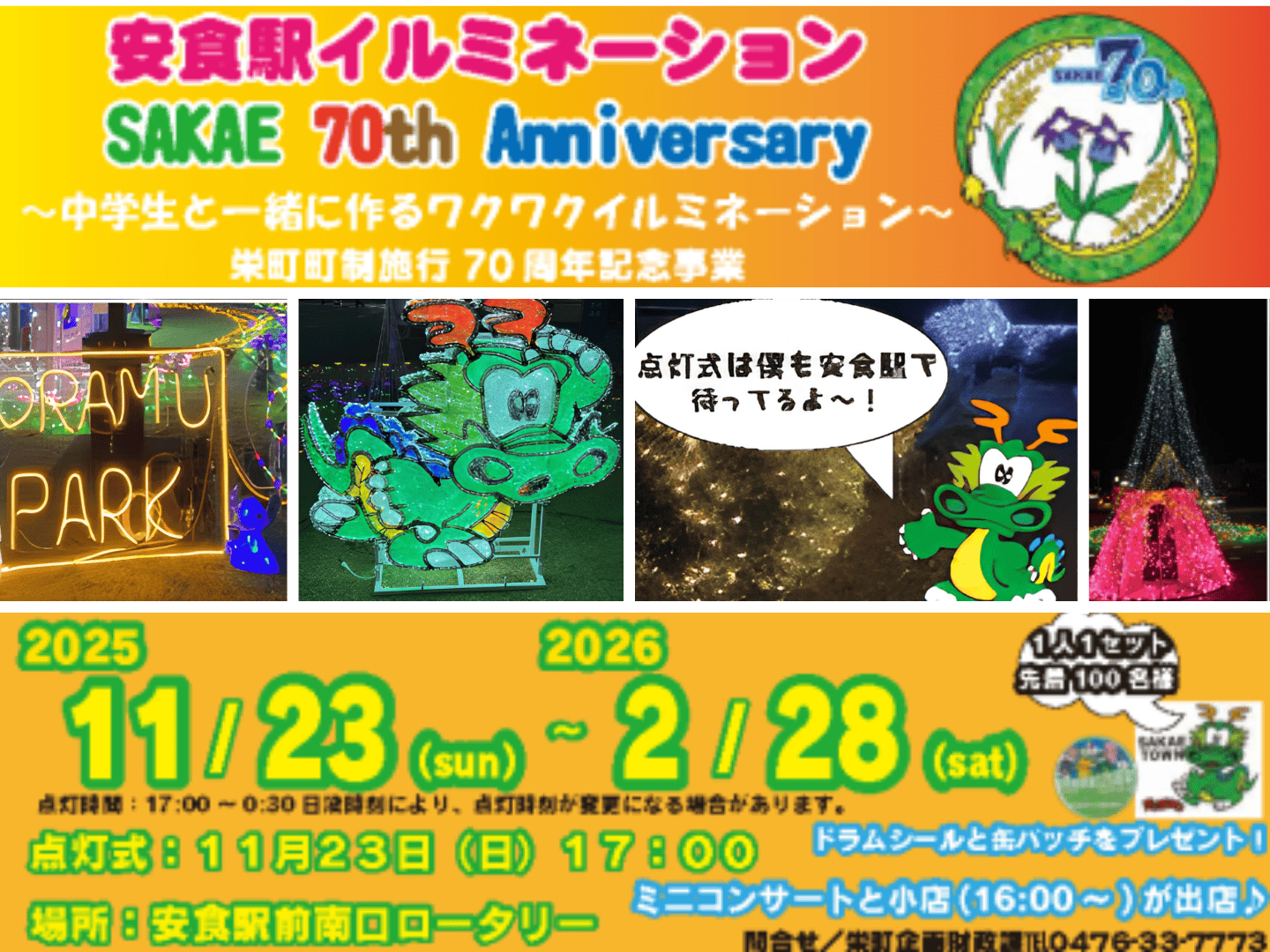 冬のお出かけに欠かせないイルミネーションが、今年もJR安食駅前を中心に開催されます。 今年は単なるイルミネーションではなく、栄町ならではの特別なコラボレーションが実現! 今年、町制施行70周年を迎えた栄町は、記念事業として町制施行70周年のロゴマークを作成してもらった地元の中学校 美術部とタッグを組みました。 ーーー💖 郷土愛を育む「地域を照らす光アート」 この企画は、単に美しい景色を作るだけでなく、地元の中学生が地域貢献と郷土愛を育む貴重な機会となっています。生徒たちが制作したオリジナルのアート作品が会場に設置され、駅前の光の演出を彩ります。 企画やデザインに直接関わることで、「自分たちの町を自分たちで盛り上げる」という意識も高まり、中学生の感性と情熱、そして地元愛が詰まった、心温まるイルミネーションを ぜひ見にいらしてください。 ーーー点灯期間✨✨ 2026年2月28日(土)まで 17:00~0:30 ※日没時間によって点灯時間が変わります。