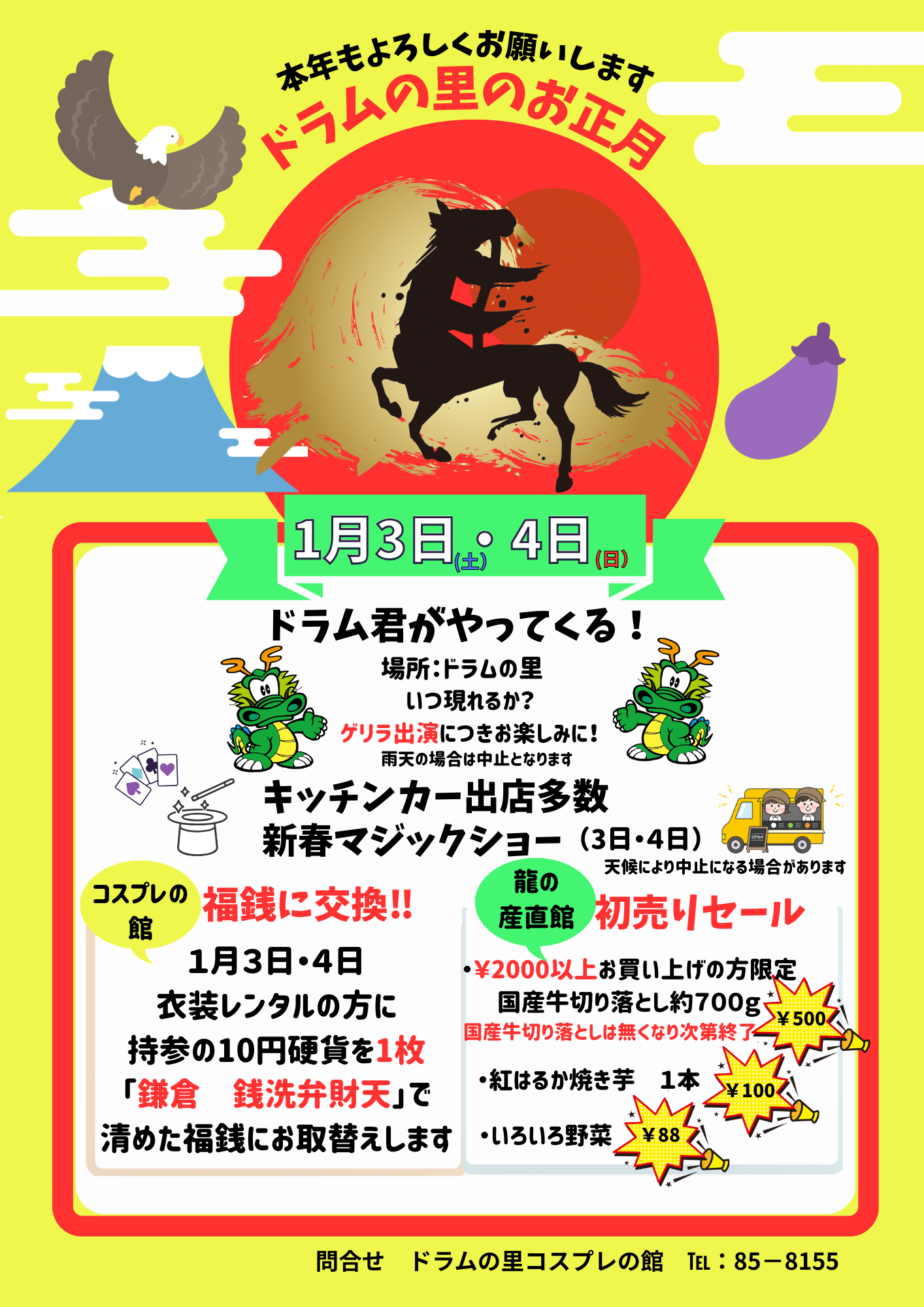 お正月のお出かけは、栄町の人気スポット「ドラムの里」へ! 通常の初詣とはひと味違う、「和装コスプレ」と「開運のお金交換」が楽しめる特別な2日間です。 ーーー福銭と交換! 新年の金運アップ術! 「ドラムの里」内のコスプレの館では、衣装をレンタルした方限定の特別な開運イベントを実施します。 鎌倉 銭洗弁財天宇賀福神社で清めた福銭(10円硬貨)と、ご持参いただいた10円硬貨を1枚交換! この機会に幸運を手に入れてみてはいかがでしょうか? ーーー隣接の「房総のむら」もお得に楽しむ! さらに、「ドラムの里」に隣接する房総のむらでは、当日に和装(着物など)で来場された方の入場料が無料になる特典があります。 コスプレの館で和装に着替えて、江戸時代の街並みが再現された「房総のむら」を散策すれば、タイムスリップしたような気分で最高のお正月を満喫できますよ! ーーー大鷲神社で初詣 近隣には、地域の歴史と信仰を支えてきた重要なパワースポット、安食地区に鎮座する大鷲神社(おおわしじんじゃ)が存在します。 縁結び・子宝・出世開運・商売繁盛などの守護神であり、日本一の魂生大明神が奉られていることでも有名です。 ーーー開催内容 ■開催日: 2026年1月3日(土)・4日(日) マジックショー、人気のキッチンカー出店なども予定! この冬は、栄町のキラキラ輝く駅前イルミネーションと、ユニークで縁起の良いお正月のイベントで、ぜひ素敵な思い出を作ってください!