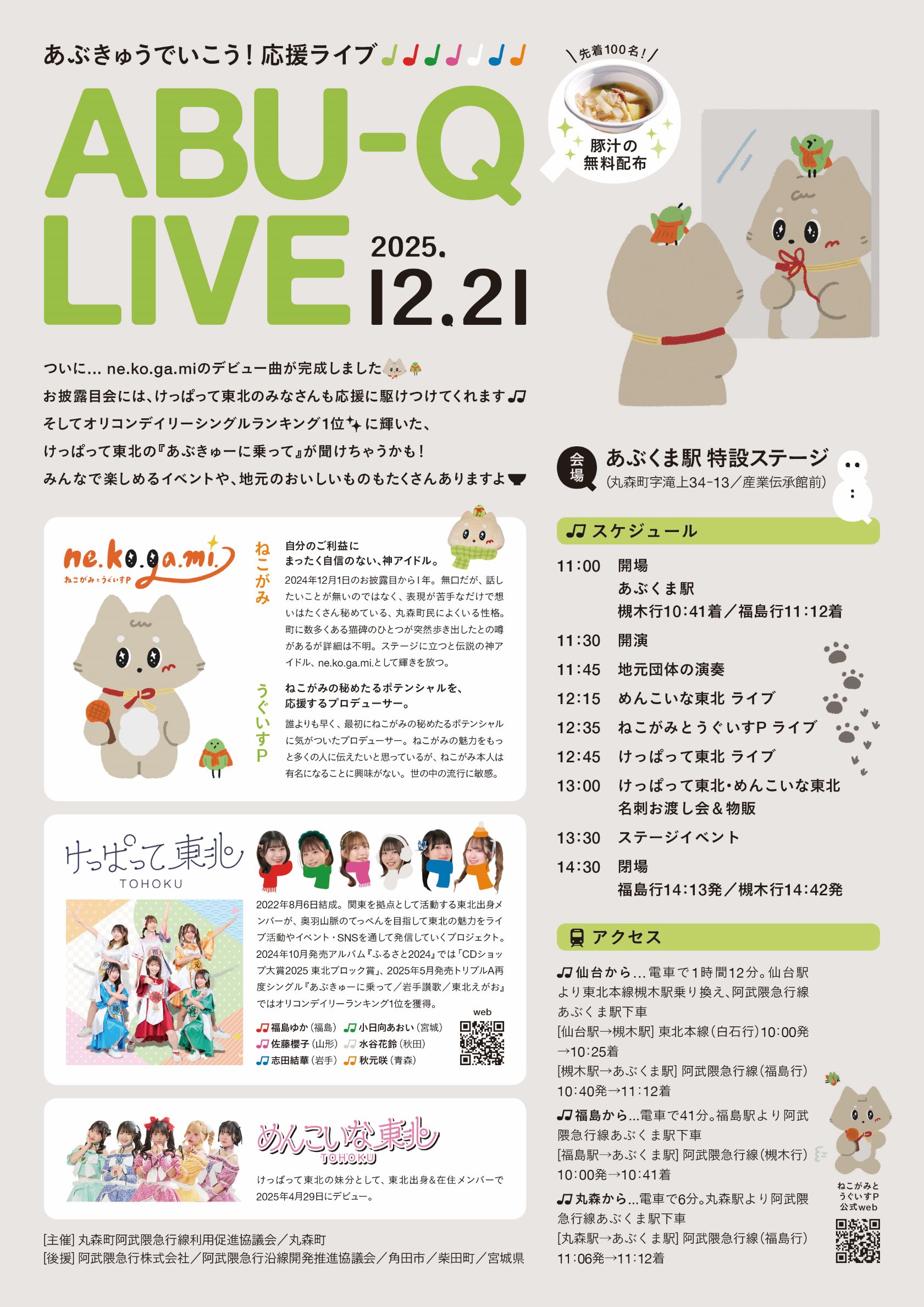 このたび、丸森町公式キャラクター「ne.ko.ga.mi.」のデビュー曲お披露目ライブを開催します🎤 当日は、東北を元気に盛り上げる「けっぱって東北」の皆さんも応援に駆けつけ、会場を一緒に盛り上げてくれます♪ 初めてのステージとなる記念すべきデビューライブを、ぜひ会場でご覧ください✨