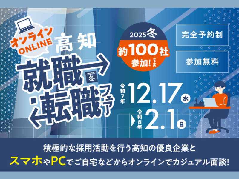 💻高知の優良企業と、オンラインでカジュアル面談してみませんか? 高知へのU・Iターンを考えている方、 「いつかは高知で働きたい」「情報収集から始めたい」 そんな想いがある方にぴったりのイベントです🌱 👨💻オンラインで面談できる 👀企業からスカウトが届くかも!? 💬プロによるキャリア相談も受付中! もちろん、参加は無料・服装自由・スマホ参加OK📱 「まだ転職は考えてないけど、話だけ聞いてみたい…」 そんな“ちょっと気になる”くらいの気持ちでも大歓迎! 一歩踏み出すあなたを、 高知の企業がしっかり受け止めてくれますよ😊 【オンライン高知就職・転職フェアとは?】 U・Iターン者や、新卒者の採用に積極的な高知の企業と、オンライン上でカジュアルな面談ができるイベントです。 フェアの対象者は、U・Iターンをお考えの高知県外在住者と、県内外の学生です。 ※いつかは高知に帰りたい、など検討中の方も大歓迎。 ※まずは情報収集から、という方には「キャリア相談」をお勧めします。 【3つの特徴】 ①企業の採用担当者とオンライン面談ができる 出展企業は、長らく高知で安定経営を続ける企業や、高知にありながら世界や日本でTOPシェア製品を持つニッチトップ企業、新しい事業分野で活躍する高知のベンチャー企業など様々。未経験者や異業界からの転職者歓迎という企業もたくさんあります。興味が湧いた企業とは積極的にオンライン面談を。面談というより、カジュアルなリモート会社訪問です。会社の考えを知り、雰囲気をつかんで次のSTEPに活かしましょう。 ②企業からのスカウトを受けられる可能性がある スカウト希望を登録いただくと、企業から「あなたのキャリアやスキルをもっと知りたい!」とオファーが届くかも。 企業が事前に閲覧できる情報は、希望職種や希望年収、保有する資格や自己PR等、個人を特定されない範囲のみなので、在職中の方も安心です。 あなたが、ご自身のキャリアにあった求人を見つけられなくても、企業の方があなたのプロフィールから可能性を見いだしてくれるかもしれません。 ※スカウトは辞退することもできます。 ③キャリア相談であなたの希望に合う企業を探せる 「高知へUターンしたい気持ちはあるけど、今のスキルを活かせそうな企業はあるの?」「子育て環境を考えるならやっぱり田舎がいい、でも仕事は?収入は?」など、遠く離れた高知での就職・転職に関する疑問や不安はたくさんあるはず。 一人で悩まずお気軽に相談してください。