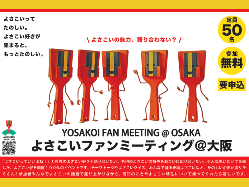 各地のよさこいの特色をお互いに知り合いたい。そんな思いだけで企画 した、よさこい好き純度100%のイベントです。テーマトークやよさこいクイズ、みんなで踊る正調よさこいなど、たのしい企画が盛りだ くさん! 参加者みんなで思いっきり盛り上がるついでに、高知のことやよさこい祭りについて知ってくれたら嬉しいです。 当日は、高知にゆかりのあるドリンクやお菓子をご用意いたします! ご家族・ご友人をお誘いあわせの上、ぜひ気軽にご参加ください! さらに! ①参加者全員に「よさこい移住プロジェクト」オリジナルキーホルダーをプレゼント! ②1名様に高知への片道航空券が当たる! 詳細・お申込みは、高知県移住ポータルサイト「高知家で暮らす。」から。 まずは「申し込み情報」のURLをクリック✨