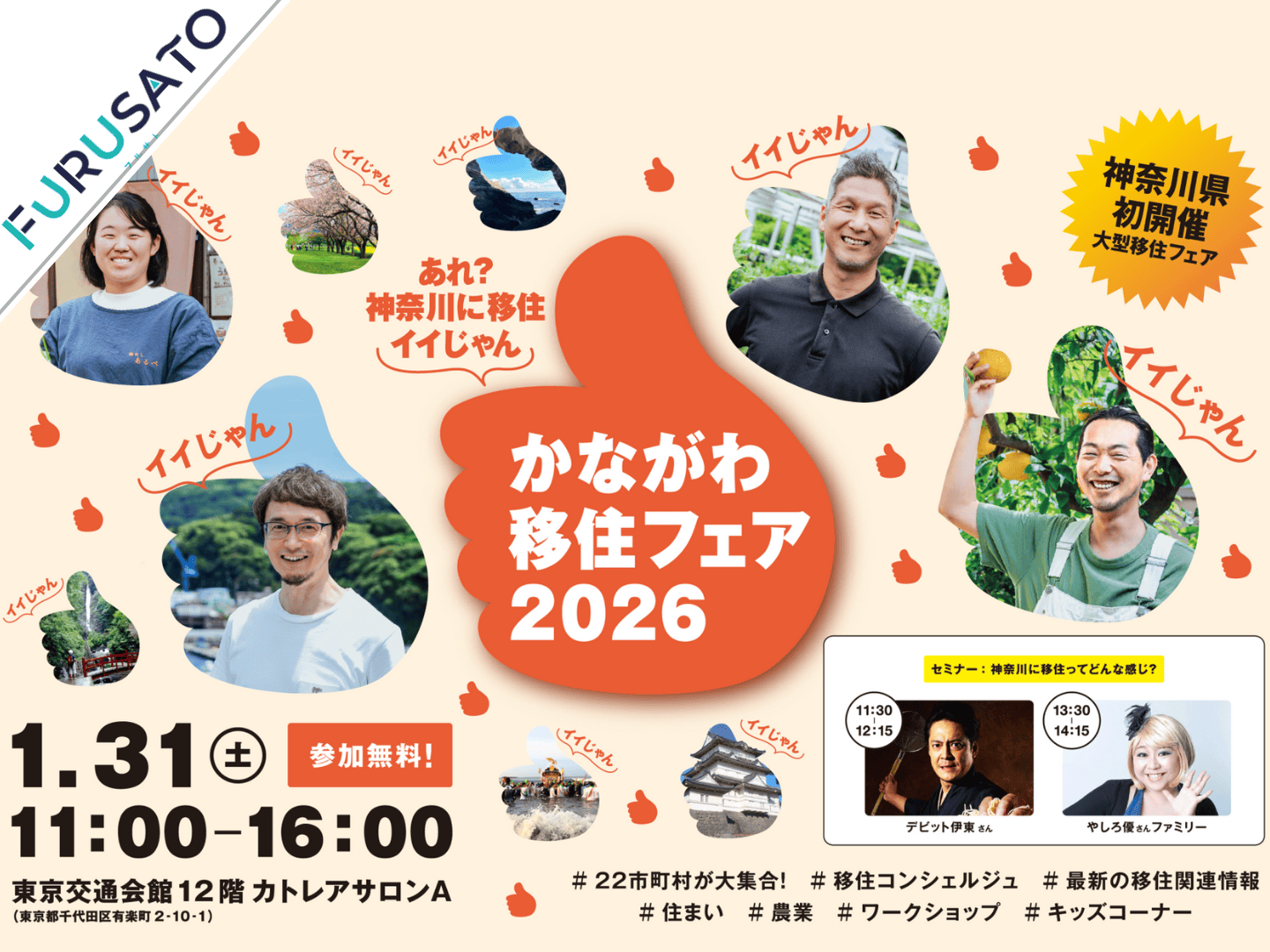 あれ?神奈川に移住イイじゃん。 移住=大きな決断、じゃなくてもいい。 今の暮らしの延長線で考えられる選択肢も、ちゃんとあります。 「気になっている」その段階から、大歓迎。 神奈川移住のリアル、覗いてみませんか。意外な出会いがあるかも! ーーーーー かながわ移住フェア2026 ーーーーー ■開催日: 2026年1月31日(土) 11:00~16:00 ■会場: 東京交通会館12階 カトレアサロンA (東京・有楽町) 東京都千代田区有楽町2丁目10−1 ■参加費:無料! 下記のリンクから事前登録いただくと、当日スムーズにご入場いただけます。 https://app.spot-recorder.jp/798577_kanagawa_iju260131/ ▶詳細はこちらから https://www.furusato-web.jp/event-info/p248755/ 【出展自治体(22市町村)】 ・三浦半島エリア:横須賀市・逗子市・三浦市 ・県央エリア:相模原市・清川村 ・湘南エリア:平塚市・茅ヶ崎市・秦野市・伊勢原市・寒川町・大磯町・二宮町 ・西湘足柄エリア:小田原市・南足柄市・中井町・大井町・松田町・山北町・開成町・箱根町・真鶴町・湯河原町