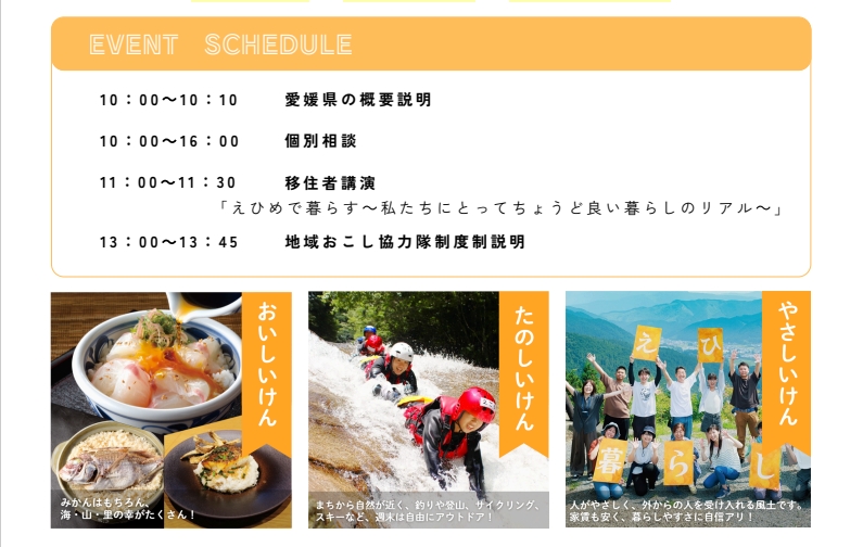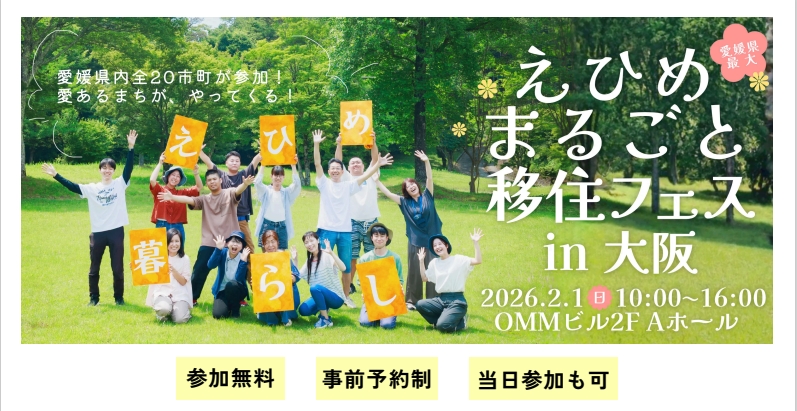 🍊開催概要🍊 日時:2026年2月1日(日)10:00~16:00 会場:OMMビル 2階 Aホール (大阪府大阪市中央区大手前1-7-31) 参加費:無料 参加方法:事前予約(当日参加も可) ⏰タイムスケジュール⏰ 10:00~10:10 オープニング 愛媛県の魅力をサクッとご紹介 10:10~16:00 個別相談 気になる市町・団体に個別相談ができます 11:00~11:30 移住者講演 「えひめで暮らす~私たちにとってちょうど良い暮らしのリアル~」 ゲスト:三輪 聡太さん、三輪 梓帆里さん 先輩移住者の声を聞けるチャンス! 13:00~13:45 地域おこし協力隊 制度紹介 隊員トークセッション 市町募集説明