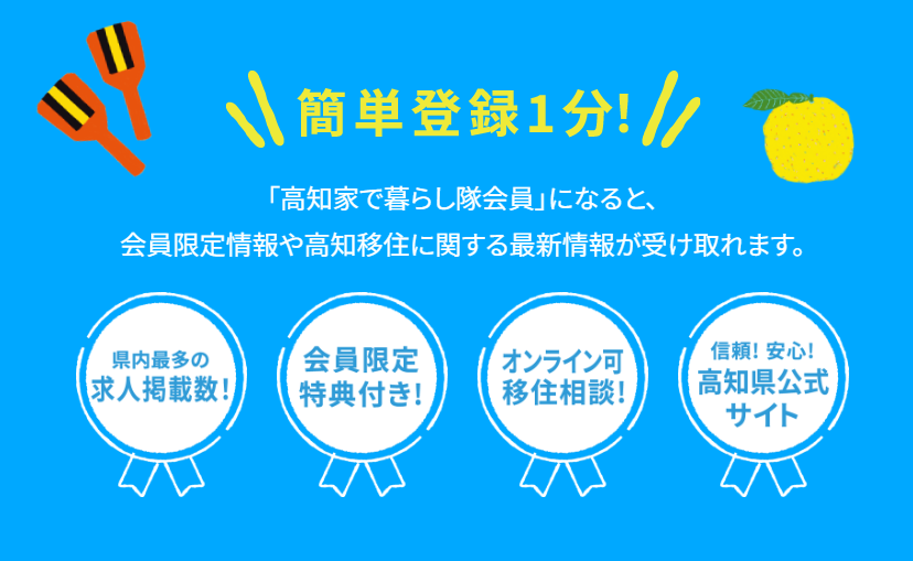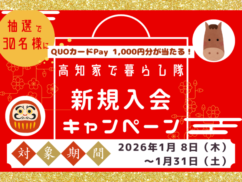 このキャンペーンは、1月8日~1月31日だけの期間限定です! 高知での新生活をスタートするために、今すぐ「高知家で暮らし隊」に登録して、会員特典をゲットしましょう! ◆キャンペーン内容◆ \高知家で暮らし隊/ 年明け!新規入会キャンペーン ◆対象期間◆ 2026年1月8日(木)~1月31日(土) ◆対象条件◆ 下記①②の両方を満たした方 ①上記期間中に「高知家で暮らし隊」へ新規登録された方 ②メルマガの配信を希望された方 (ご登録時に「 メルマガ配信希望」にチェック☑を入れていただくことで選択できます) ◆プレゼント内容◆ 抽選で30名様に、QUOカードPay 1,000円分 (全国の約6万店舗で利用可能です) ◆当選発表◆ 2026年2月中旬を目処に、当選者の皆様へギフトURL付きのメールをお送りいたします。 送信元アドレスは〈iju@iju-jinzai.kochi.jp〉となりますので、迷惑メールフォルダに振り分けられないよう、あらかじめ受信設定をご確認ください。 ◆留意事項◆ ・ キャンペーン期間外にご登録いただいた場合、または過去にご登録済みの方は、プレゼントの対象外となります。 ・ 抽選対象となるには、【対象期間中の新規登録】および【メルマガ配信希望】の両方の条件を満たす必要があります。 ・ ご登録後、移住コンシェルジュより、今後のサポートのご意向を確認するためご連絡を差し上げます。 お申込みは、高知県移住ポータルサイト「高知家で暮らす。」から! 「申し込み情報」のURLから今すぐアクセス♪