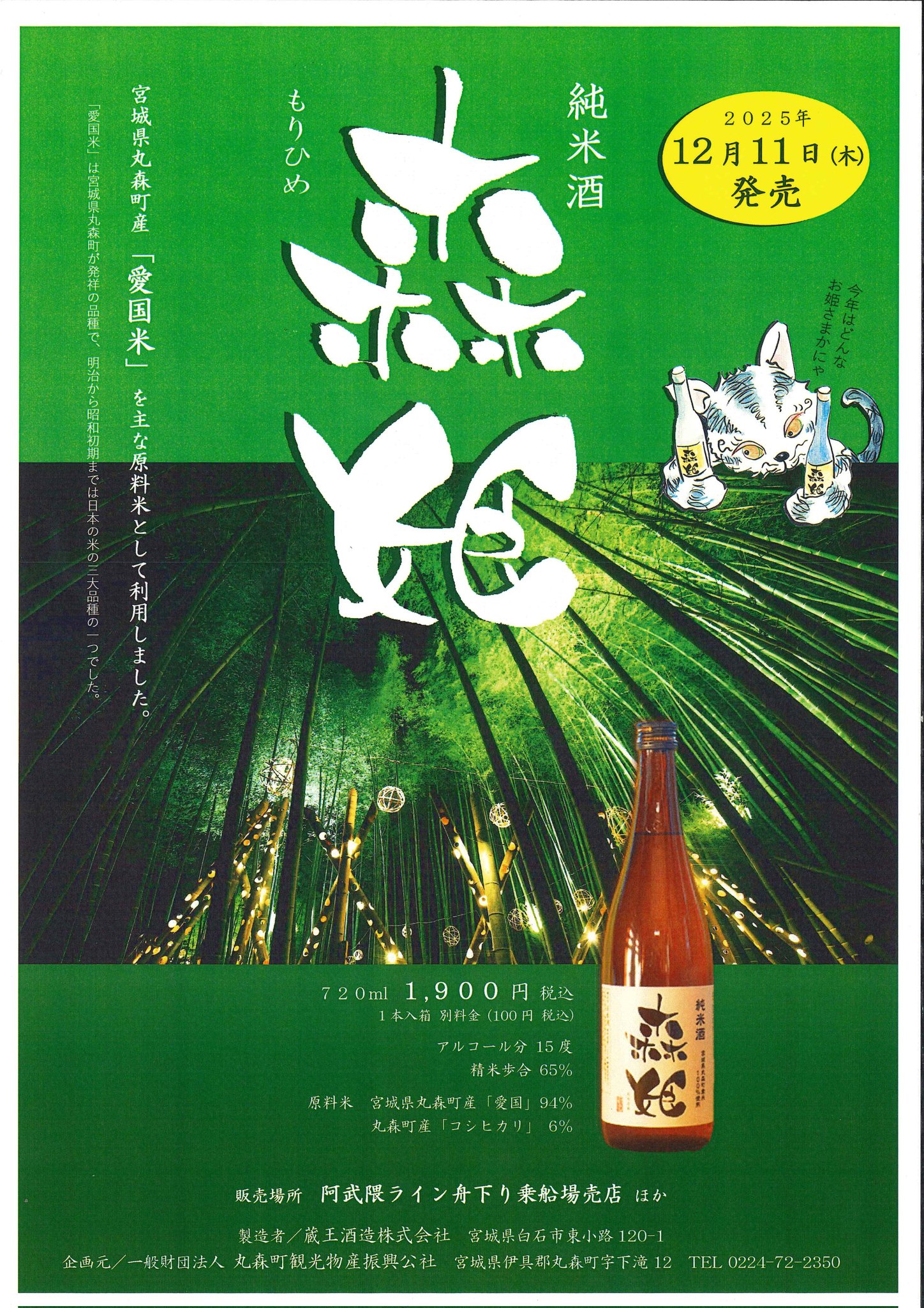 2025年12月11日(水)から、「愛国米」など丸森産米を100%使用した純米酒『森姫(もりひめ)』の販売が始まりました。「愛国米」は丸森町が発祥の品種で、明治から昭和初期まで日本の米の三大品種の一つでした。今年はキリっと淡麗な味わいに仕上がっているようです。ぜひご賞味ください。