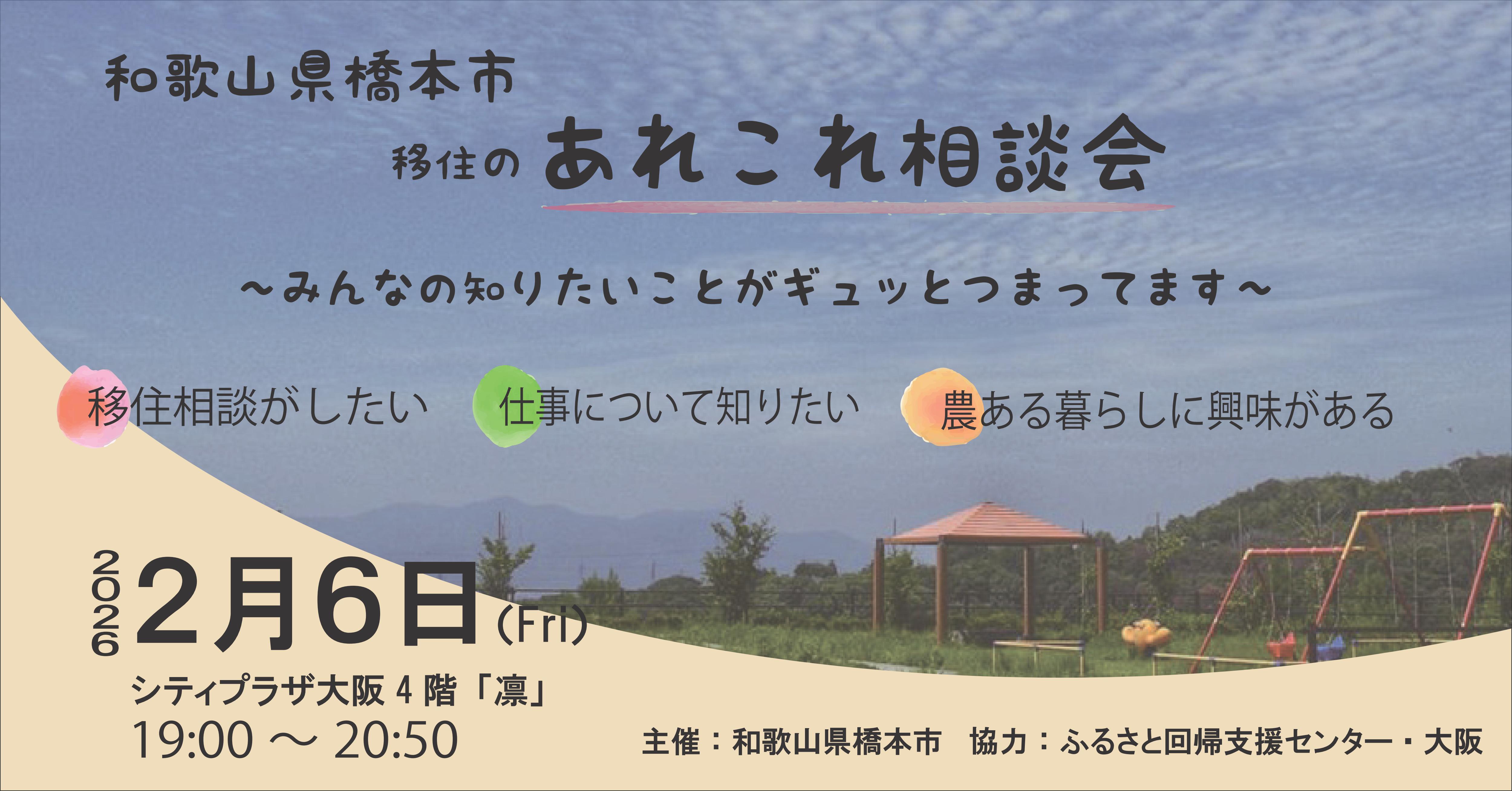 橋本市 移住のあれこれ相談会(ナイター) 日時:2月6日 金曜日 午後7時~午後8時50分まで 場所:シティプラザ大阪4F(大阪市中央区本町橋2-31) 内容:19:00~19:15 橋本ってどんなまち? 19:15~19:30 住まいの探し方 19:30~19:45 仕事の探し方 19:45~20:00 農ある暮らしのはじめ方 20:00~20:50 個別相談(※参加希望者のみ) 大阪・本町にて、皆さんの気になる"あれこれ"をギュッとつめたナイター相談会を開催します! 「住まいの探し方」「仕事の探し方」「農ある暮らしのはじめ方」の3つのテーマをお話します! それぞれの不安や疑問に、各相談員が個別相談でもお答えしますので、お一人ではわからないようなこともこの機会にぜひお聞かせください。 お仕事終わりのご来場も大歓迎です。