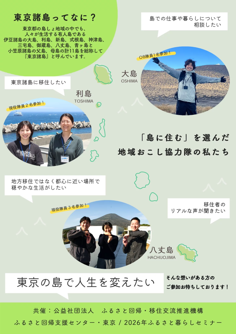 「島での仕事はどう探す?」 「生活費はどのくらい?」 島暮らしのそんな疑問に、現場を知り尽くした地域おこし協力隊が直接お答えします! 大島・利島・八丈島の3島から計6名の現役隊員・OBが参加予定。 ーーーーー 東京諸島の移住定住トークイベント&相談会 「地域おこし協力隊に聞く!あなたは何しに東京の島へ!?」 ーーーーー ■日時: 2026年3月8日(日) 17:30~19:30 ■会場: 東京交通会館8階ふるさと回帰支援センター・東京 セミナールームC (東京・有楽町) ■定員:20名 ■参加費:無料! ※事前予約制、定員に達し次第、締め切らせていただきます。 お早目にお申込みください!! ▶詳細はこちら https://www.furusato-web.jp/event-info/p256093/