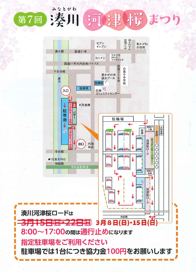 湊川河津桜ロードは、3月8日(日)、15日(日)の8時から17時の間は通行止めとなります。指定駐車場をご利用ください。また、駐車場では1台につき協力金100円をお願いします。