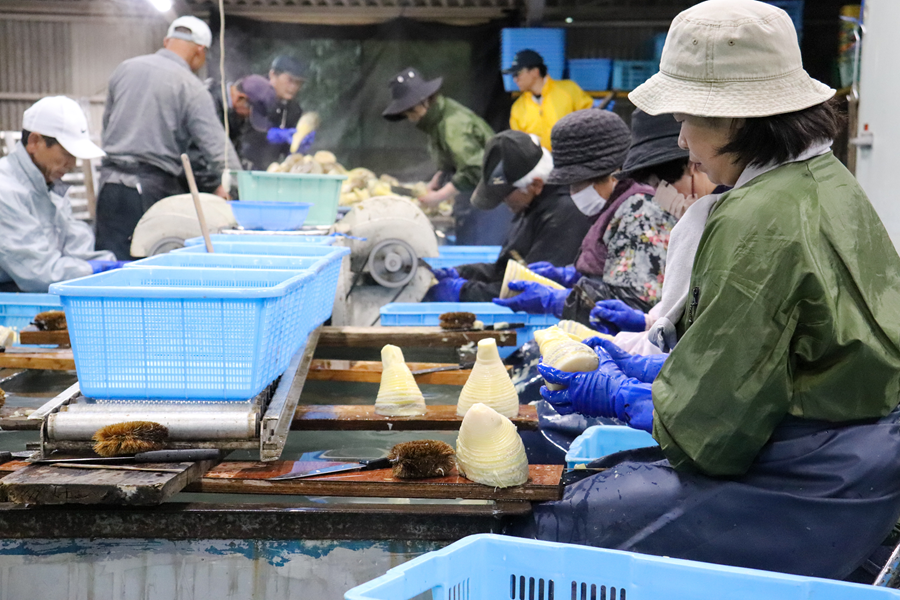 蒸し上がったタケノコの皮を剥き、出荷できるように形をきれいに整えます。