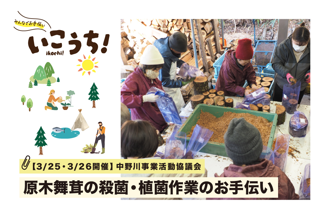 プログラムの内容 開催日時 :2026年3月25日(水)8:30〜11:30 2026年3月26日(木)8:30〜11:00 ※1日から参加可能です。 ※希望日を申込フォームに入力してください。 ※各日の予約状況は申込フォームでご確認いただけます。 開催エリア:いの町 主 催 者 :中野川事業活動協議会 対 象 :どなたでもご参加可能ですが、お子様は小学生以上でお願いします。 応募締切 :2026年3月22日(日)17:00 今回は、「中野川地区」が生産する原木舞茸の「殺菌・植菌作業」をお手伝いいただける方を募集します。 今回の作業場所については、主催の「中野川地区」ではなく、同じ本川エリアにある「集落活動センター氷室の里」の施設をお借りして行います。 「中野川地区」と会場の「氷室の里」は、車で30分ほど離れています。 集合場所をお間違えのないよう、ご注意ください。 【3/25(水):殺菌作業】 ①舞茸の袋詰め:舞茸の原木をビニールに詰めて、菌糸の活着を促進するおがくずをまぶす作業です。 ②舞茸の殺菌:袋詰めした原木を殺菌用の機械まで運んでいただきます。 ③クヌギの玉切り:チェンソーを使い、次回の作業用の玉切りを行います。 【3/26(木):植菌作業】 殺菌が終わった原木に植菌をし、培養室に運んでいただきます。