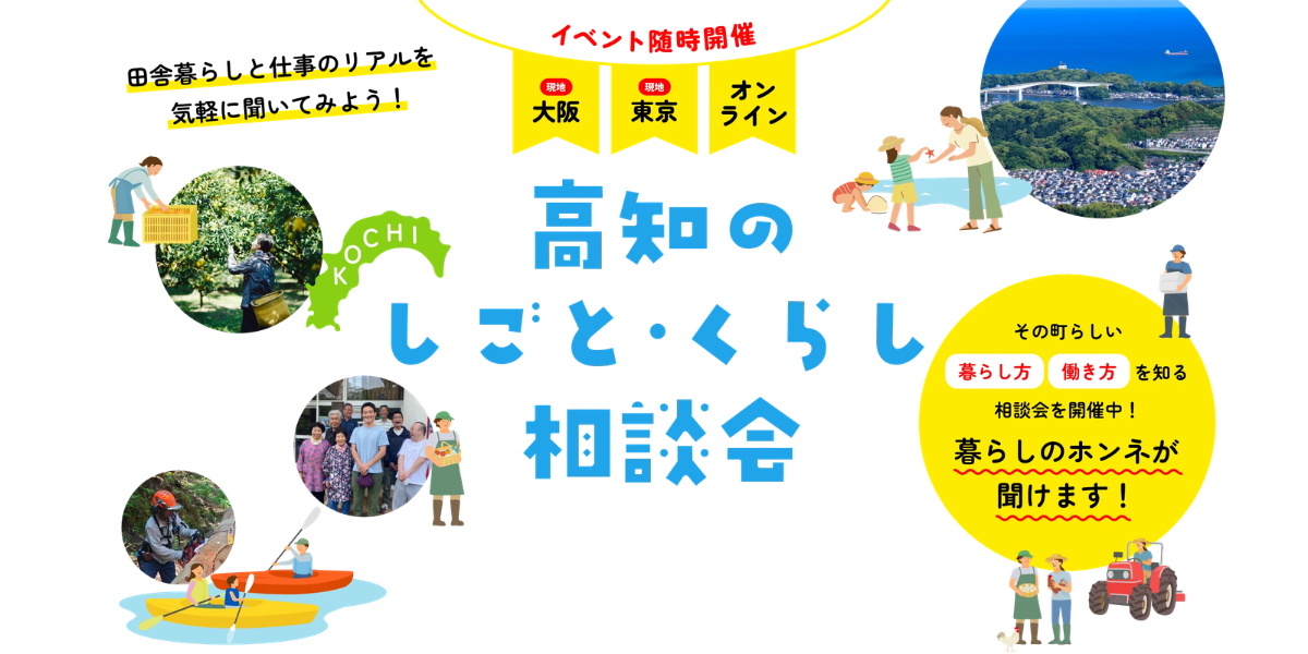 高知県では、 ●ご希望の暮らしができる地域のご紹介 ●夢を実現するための働き方のご提案 ●高知県の自然・文化・食・人といった魅力が分かるイベントの開催 をしています。 このページではその中でも「特におススメな情報」をご紹介します! ご覧いただいて少しでも『気になる!』という方は当ページ下部の「くわしい話を聞きたい」からお問い合わせいただければ、もっと詳しくご案内いたします! --------------- 東京・大阪で「しごと・くらし相談会」を開催! 1対1の個別相談(50分)なので、周りを気にせず本音で話せます。 「どんな仕事や支援制度がある?」「ぶっちゃけ生活費は?」…気になる疑問を聞いちゃいましょう! さらに! 現地訪問の交通費補助もご用意!(要件有り) ぜひご予約を! 🗼🗼🗼🗼🗼🗼 【東京:5/16(土)】 🗼🗼🗼🗼🗼🗼 ・四万十町:「海」「山」「川」のすべてがそろう クラインガルテンなど移住者向け物件豊富! ・仁淀川町:山があれば暮らしていける! 新規就農した先輩移住者の話を聞いてみない? ・土佐れいほく地域:もりと生きる、という選択 狩猟、山菜採り、草木染め、農業…里山の恵みを活かして暮らす 📅日程:2026年5月16日(土)12:00〜17:00 📍会場:ふるさと回帰支援センター セミナールームB(有楽町・東京交通会館8階) ※各自治体 限定5名(先着順・要予約) ▼ 詳細・お申し込みはこちらから 【四万十町】:https://kochi-iju.jp/event/details_921.html 【仁淀川町】:https://kochi-iju.jp/event/details_923.html 【土佐れいほく地域】:https://kochi-iju.jp/event/details_925.html 🐯🐯🐯🐯🐯🐯 【大阪:5/23(土)】 🐯🐯🐯🐯🐯🐯 ・高知市:「街」と「自然」のぼっちり生活 利便性は譲れない、でも海・山・川もすぐそばに欲しい! ・津野町:「星」と「森」の源流ライフ 四国カルストの絶景と満天の星。地域おこし協力隊も活発! ・東洋町:「海」と「仲間」のサーフライフ 関西に一番近い高知。マルチワークなど新しい働き方が可能。 📅日程:2026年5月23日(土)10:30〜16:20 📍会場:シェアオフィスThe DECK(大阪市中央区南本町2-1-1)※堺筋本町駅直結 ※各自治体 限定5名(先着順・要予約) ▼ 詳細・お申し込みはこちらから 【高知市】:https://kochi-iju.jp/event/details_920.html 【津野町】:https://kochi-iju.jp/event/details_922.html 【東洋町】:https://kochi-iju.jp/event/details_924.html